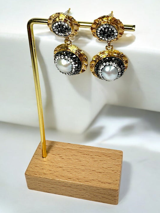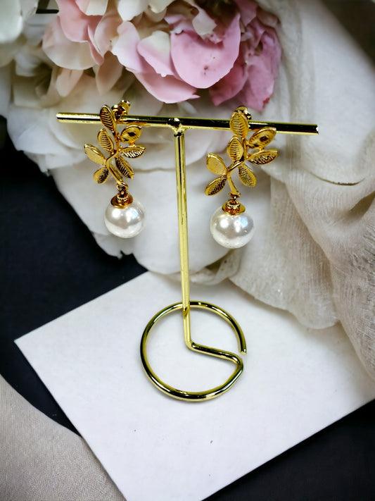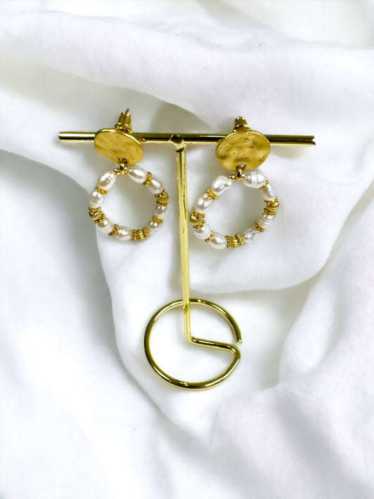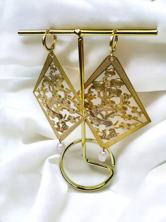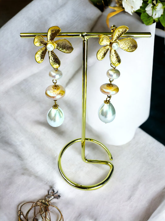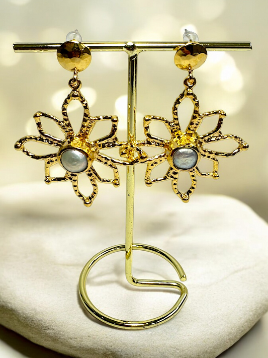 Diana Flower Pattened Metal and Freshwater Pearl Earrings